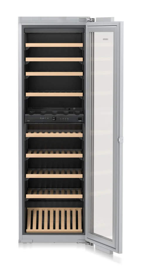 La cava de vinos empotrable Liebherr ofrece capacidad para 80 botellas y cuenta con dos zonas de temperatura independientes, ideales para conservar vinos tintos y blancos simultáneamente. Incluye estantes de madera extraíbles, iluminación LED regulable, control táctil LCD y filtro de carbón activado. Su diseño silencioso (32 dB) y eficiencia energética la hacen perfecta para amantes del vino que buscan elegancia, funcionalidad y almacenamiento profesional en casa.